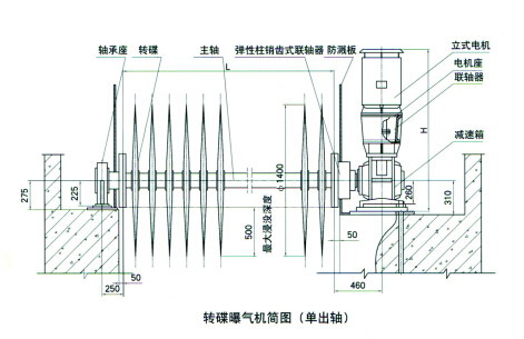 BZD型轉(zhuǎn)碟曝氣機(jī)由電機(jī)、減速箱、聯(lián)軸器、主軸、碟片、軸承座等構(gòu)成,其特點(diǎn)如下: