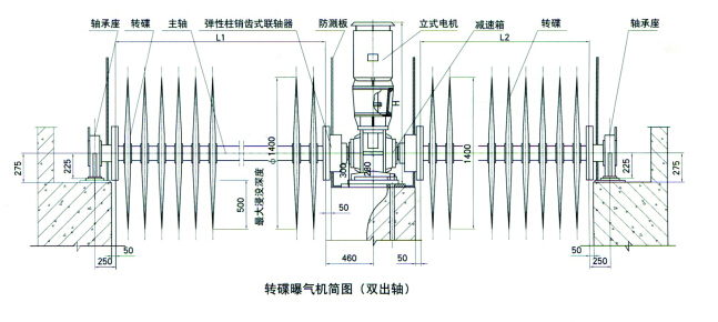 2、 根據(jù)氧化溝的形式要求,轉(zhuǎn)碟曝氣機(jī)的減速機(jī)可配置成雙出軸型。也可根據(jù)用戶要求,主軸長度、碟片數(shù)量和功率配置進(jìn)行特殊設(shè)計(jì);