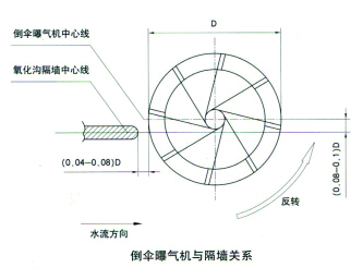 ⑶、氧化溝中間隔墻至葉輪緣間距以0.05?0.1倍葉輪直徑為宜,如無導(dǎo)流墻時,葉輪中心宜向出水側(cè)偏移,偏距約為 0.1倍葉輪直徑,以利于水的流動(見圖3)。