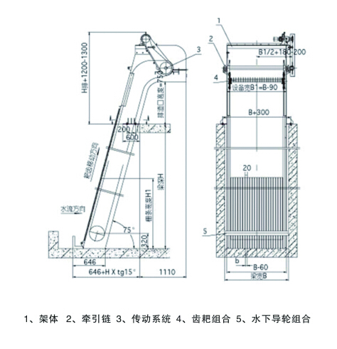 耙固定于鏈條上,鏈條沿導(dǎo)軌運行,齒耙從柵條的后部下行,從底部運行至柵條前部,從下向上地將被柵條攔住的漂浮物順著擋板撈至卸渣口咱,卸入柵渣車中。 反撈格柵主要由架體、牽引鏈、傳動系統(tǒng)、齒耙組合、主柵、副柵、水下導(dǎo)輪組合等組成。