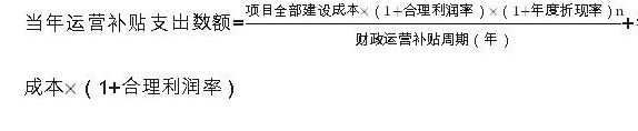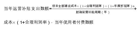 對可行性缺口補助模式的項目,在項目運營補貼期間,政府承擔部分直接付費責任。政府每年直接付費數額包括:社會資本方承擔的年均建設成本(折算成各年度現值)、年度運營成本和合理利潤,再減去每年使用者付費的數額。計算公式為: