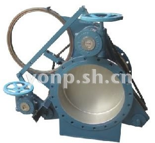 該閥門由左閥體、中閥體、右閥體、扇形盲板、絲桿螺母付、不銹鋼補償器、兩個蝸輪傳動機構等組成。它是通過三根絲桿連 成一體,并把三個閥體分別固定在底座上,構成一個剛性結構體。中閥體與右閥體用不銹鋼膨脹管聯(lián)接,左、中閥體分別用三根兩 端帶左右梯形螺紋的絲桿聯(lián)接,將三根絲桿同時作正向(或反向)旋轉(zhuǎn),則左、中兩閥體得到壓緊(或分離)。三根絲杠中上面一 根絲桿中間裝有盲板,盲板繞該軸心旋轉(zhuǎn)。下面兩根絲桿在同樣的部位上安裝有盲板的定位塊,盲板旋轉(zhuǎn)時可以防止盲板漂移,避 免密封膠圈擦傷。其中一根上裝有蝸輪傳動機構,實現(xiàn)松開夾緊閥體的目的。