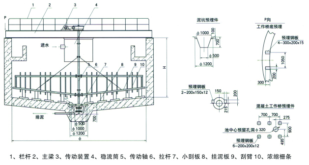 濃縮機(jī)由中心傳動(dòng)裝置驅(qū)動(dòng)傳動(dòng)軸、刮臂等旋轉(zhuǎn),刮臂上的刮板將污泥由池邊逐漸刮至池中心的泥坑中,通過(guò)排泥管排出池外;刮臂上固定有攪拌柵條,旋轉(zhuǎn)時(shí)對(duì)污泥攪動(dòng)使水和氣體外溢,提供絮狀污泥的沉淀空間,加速污泥的下沉,提高濃縮效果。