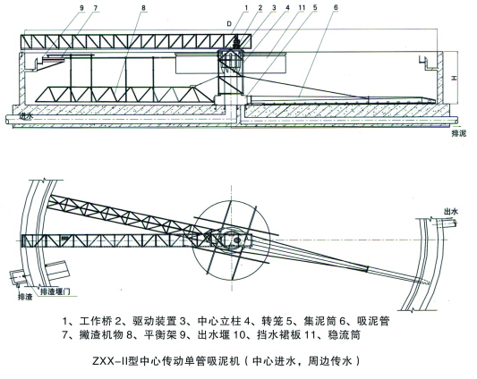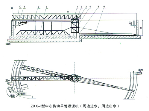 3、 單(雙)管吸泥機(jī)一側(cè)設(shè)吸泥管,另一側(cè)設(shè)刮泥板,或兩側(cè)均為排泥管,使排泥更徹底;
