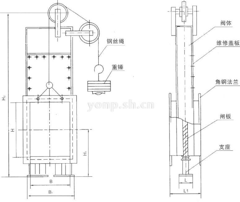 本閥由閥體、閥板、鋼絲繩、重錘等組成,通過滑輪轉(zhuǎn)動帶動鋼絲繩作直線運(yùn)動,以到開閉的目的。