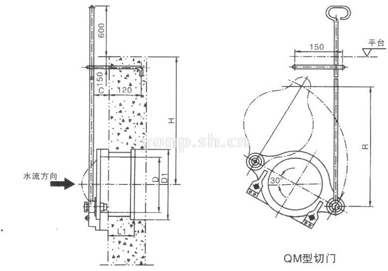 QM型切門適用于密封要求不高,啟閉方便或需臨時(shí)斷水流場(chǎng)合。切門以座側(cè)鉸支點(diǎn)作支點(diǎn),另一點(diǎn)與拉桿鉸接,切門繞支點(diǎn)90°即 可打開門體,拉桿上部焊掛鉤,作開啟后懸掛支點(diǎn)。