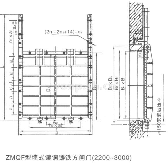 ZMQF型墻式鑲銅鑄鐵方圓閘門外形尺寸表 單位(mm)
